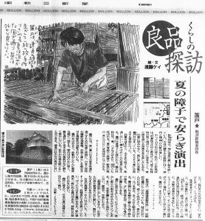平成16年 朝日新聞 くらしの良品探訪 遠藤ケイ氏 ![]() 新発田(しばた)城は、堀に葉桜の濃い緑を映していた。 石垣の穏やかな曲線に続く、表門と隅櫓(すみやぐら)の白壁が美しい。 かつて10万石の城下町だった新発田は、阿賀野地方の中心都市だった。城下町独特の曲がりくねった道を歩くと、家に財を投じる気風を見る楽しみもある。 旧家に招かれると、庭に面した座敷に簾戸(すど)がはまっている。そろそろ夏に衣替えする季節になった。 初夏を迎えると、襖や障子を、風通しのいい簾(すだれ)をはめこんだ建具に替える。 簾戸は夏障子とも言われる。簾の材料は、竹、葦、萩などがあり、葭戸(よしど)とも呼ばれる。 夏の季語で「葭障子 細身の風の 来たりけり」(草間時彦)などがある。 簾戸には、蒸し暑い日本の夏を快適に過ごすための知恵と同時に、日本人独特の繊細な美意識、自然と暮らしを融合させる情緒性が投影されている。 簾戸をはめると、座敷がとたんに風雅な趣に一変する。室内はほのかに暗く、簾を透かして見える外の風景が光に満ちて華やいでいる。涼やかな風を感じることができる。建具の杉や竹の香がにおい立つ。昼は外から中が見えにくい。安らぎがあって、くつろげる。 地理学者のJ・アップルトンによると、人間や動物が一番落ち着く風景は、「隠棲(いんせい)と探索」「眺望と隠れ」という両義的な自然の風景だといわれる。本能的に、外的や雨風から身を隠し、守るシェルターとしての家と、そこから見る視野がうまく調和していると安らぎを感じる。簾戸が、まさにそうだ。 新発田の「高橋建具製作所」は、伝統的な簾戸にこだわっている。桟は目がつんだ杉材。軽くて色がよく、香りがいい。ホゾを刻み、きっちりと組み合わせる。簾は細い竹を細かく編んで桟で挟んで張る。少し値が張るが、注文で葦や萩の簾にもできる。 簾戸に黒竹をあしらったタイプや、透かし彫りのの板をはめ込んだタイプもある。また、全面を簾にすると虫が入ってこない。縁側や、洋室にも合う。 「製造直販しかしていません。お客さんの声や要望をじかに聞いて、満足してもらえるものを作りたい」 社長の高橋孝一さん(54)がいう。セミオーダーで、依頼者に寸法を測ってもらい、ぴったりはまる簾戸を作る。家の建具を一緒に作る喜びがある。価格も市価より安い。 簾戸に替えて、日本の夏の風情を楽しむのも一興だ。 |